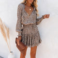 Women's Leopard Print Dress - Long Sleeve - V-Neck - Mini Length - Smocked Waist - Ruffle Hem